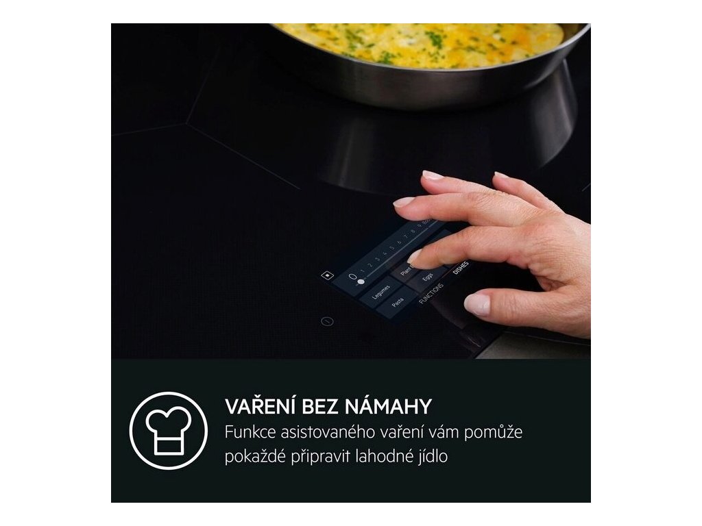 Kontrolní funkce: 3 krokové využití zbytkového tepla, akustický signál, funkce POWER (Booster) = rychlé ohřátí, dětský zámek, flexibilní Power Management, propojen s odsavačem Hob2Hood, zajištění/odjištění ovládacího panelu, Levý Bridge, rozmražení, pauza, detekce hrnců a pánví, Precise Heat, SenseCook Boil, SenseCook Fry, vypnutí zvuku, Stop Timer, ukazatel času
