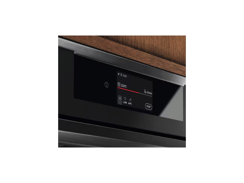 Možnost elektronického nastavení trouby: Display Full colour TFT touch 4.3 inches 9 x 5, 75 Variety of pre-set cooking programmes 'Assist', 14 Multi Step Cooking Functions, 25 Languages / Textdisplay, 3 pyrolytické cykly (rychlý, normální, intenzivní), akustický signál, ovládání aplikací, automatické vypnutí (jen trouby), nastavení hlasitosti minutky, Check Result (Finish Assist by remaining 10% duration) ('Use residual heat' screen + beep), Dětský zámek, minutka pro čištění, denní paměť 3 dny zpětně, minutka, OTA programming (excluding power board), Oven light on/off selectable (2 ways: menu, direct access on home screen), Preheating (none, eco, fast), ukazatel teploty (°C), ukazatel zbytkového tepla, Residual heat usage (only with duration), doporučená teplota, denní čas, Clock automatic adjustment, Clock style in standby (2 versions: digital, 7 segments), info k servisu, Short cut keys in standby screen, konektivita, čas vaření, čas vaření s odhadem konce, přičítání času, demo program s kódem, nastavení jasu disp., elektronická regulace teploty, elektronický zámek dveří, Electronical door switch, výběr rychlého předehřátí, jídelní sonda, automatické vypnutí jídelní sondy, jídelní sonda - indikace teploty jádra, jídelní sonda s odhadem času, tóny kláves, alarmů a chyb, aktivace/deaktivace (kromě hlavního vypínače), hlavní vypínač