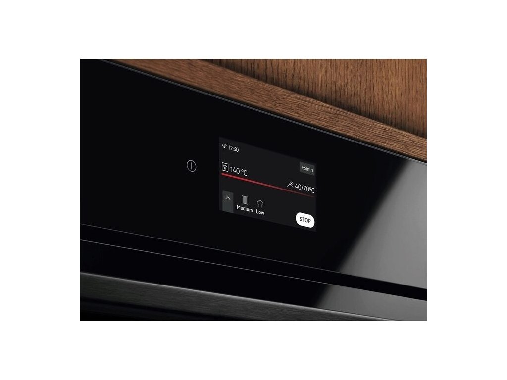 Možnost elektronického nastavení trouby: 17 Multi Step Cooking Functions, 25 Languages / Textdisplay, 6 Cleaning programs (steam cleaning, steam cleaning plus, descaling, drying, rinsing, Tank emptying), akustický signál, Display Full colour TFT touch 4.3 inches 9 x 5, 139 Variety of pre-set cooking programmes 'Assist', nastavení hlasitosti minutky, Check Result (Finish Assist by remaining 10% duration) ('Use residual heat' screen + beep), Dětský zámek, minutka pro čištění, Clock automatic adjustment, Clock style in standby (2 versions: digital, 7 segments), konektivita, čas vaření, ovládání aplikací, automatické vypnutí (jen trouby), elektronická regulace teploty, Electronical door switch, čas vaření s odhadem konce, přičítání času, demo program s kódem, nastavení jasu disp., minutka, OTA programming (excluding power board), Residual heat usage (only with duration), info k servisu, výběr rychlého předehřátí, jídelní sonda, automatické vypnutí jídelní sondy, jídelní sonda - indikace teploty jádra, hlavní vypínač, denní paměť 3 dny zpětně, jídelní sonda s odhadem času, tóny kláves, alarmů a chyb, aktivace/deaktivace (kromě hlavního vypínače), ukazatel teploty (°C), ukazatel zbytkového tepla, Oven light on/off selectable (2 ways: menu, direct access on home screen), Preheating (none, eco, fast), denní čas, nastavení tvrdosti vody, Short cut keys in standby screen, doporučená teplota