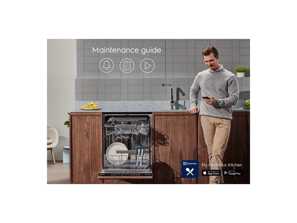 Uživatelské rozhraní QuickSelect s WiFi vám prostřednictvím aplikace My Electrolux Kitchen připomene a nabídne jasné instrukce, jak jednoduše spustit program péče o myčku, který vám pomůže udržet její dobrý stav a svěží vůni čistoty.
