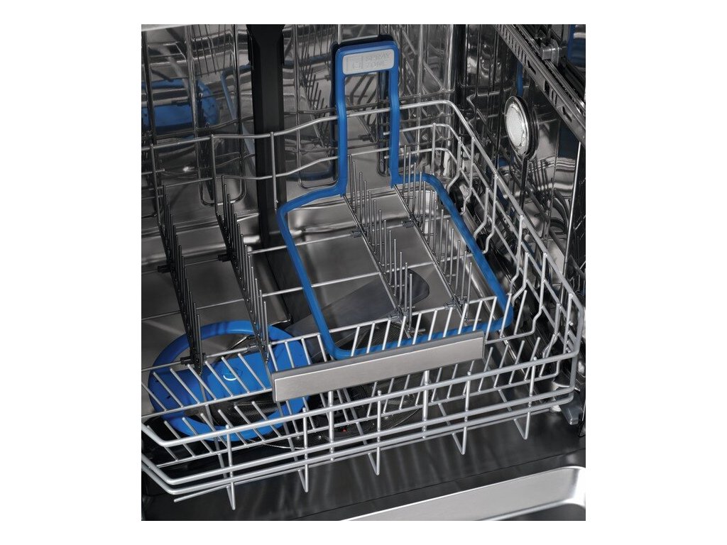 Horní košík má 2 skládací držáky, 2 skládací drátěné držáky pro skleničky, 2 měkké špičky, 6 měkkých špiček pro vinné sklenky, skládací poličky na šálky, Premium Rails, nerezové držadlo Electrolux, Postranní držáky košíku