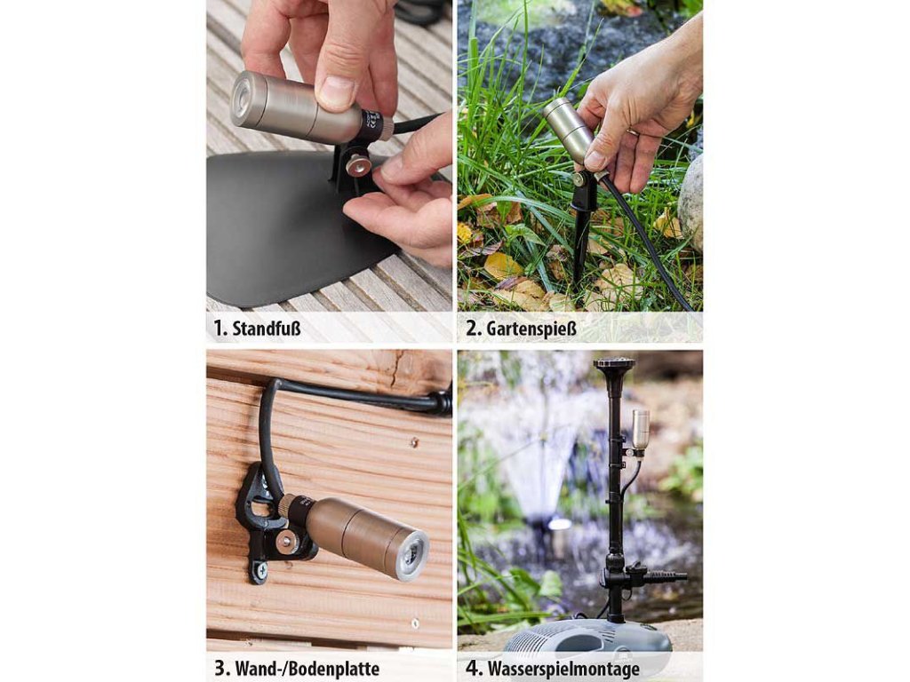 Lze použít nad i pod vodou. Díky tomu je ideální pro osvětlení jezírek, ale lze jej použít i jako zahradní světlo. Umístěte je jako nepřímé osvětlení pod rostliny. Ve tmě získáte krásný světelný efekty. Snadné umístění v jezírku díky přiložené montážní noze, v zahradě použijete praktický zápich, pro upevnění na stěnu je přiložen nástavec na přišroubování, obsahuje i svorky na přidělání na efektové čerpadlo, tím získáte krásný osvětlený vodní efekt. Stmívací senzor po setmění sám světla zapne a při rozednění vypne. Jakmile je umístěte můžete si nastavit sklon svícení. Světla nevyvíjejí teplo a jsou dodávaný včetně bezpečnostního transformátoru. Mají velice dlouhou životnost při použití pod vodou. Je použita 12 v technika pro bezpečnost. Jednoduchost systému umožňuje každému si světla nainstalovat sám.