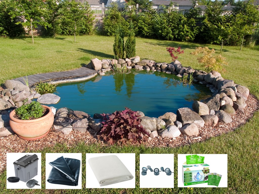 Sada pro výstavbu koupacího jezírka obsahuje jezírkovou fólii, ochranou jezírkovou geotextilii pod fólii, jezírkovou průtokovou filtraci včetně filtračních médií, bio domečky pro osídlení jezírkovými bakteriemi, filtrační houby pro hrubé nečistoty, regulovatelné čerpadlo s nízkou spotřebou, UV lampu proti tvorbě řas, hadicové přípojky na propojení čerpadla s filtrací a jezírkovou hadici. Dále roční sadu přípravku, obsahující úpravu vody, která reguluje tvrdost a ph vody, aby správně fungovali jezírkové bakterie odstraňující živiny z vody, druhá složka jsou právě jezírkové bakterie. Obsahuje 10 sáčků což stačí na pokrytí celé sezóny. Jezírkové osvětlení možné použít ve vodě i mimo, včetně výměnných barevných sklíček, pro změnu barvy osvětlení. Návod s návrhem na vybudování jezírka.