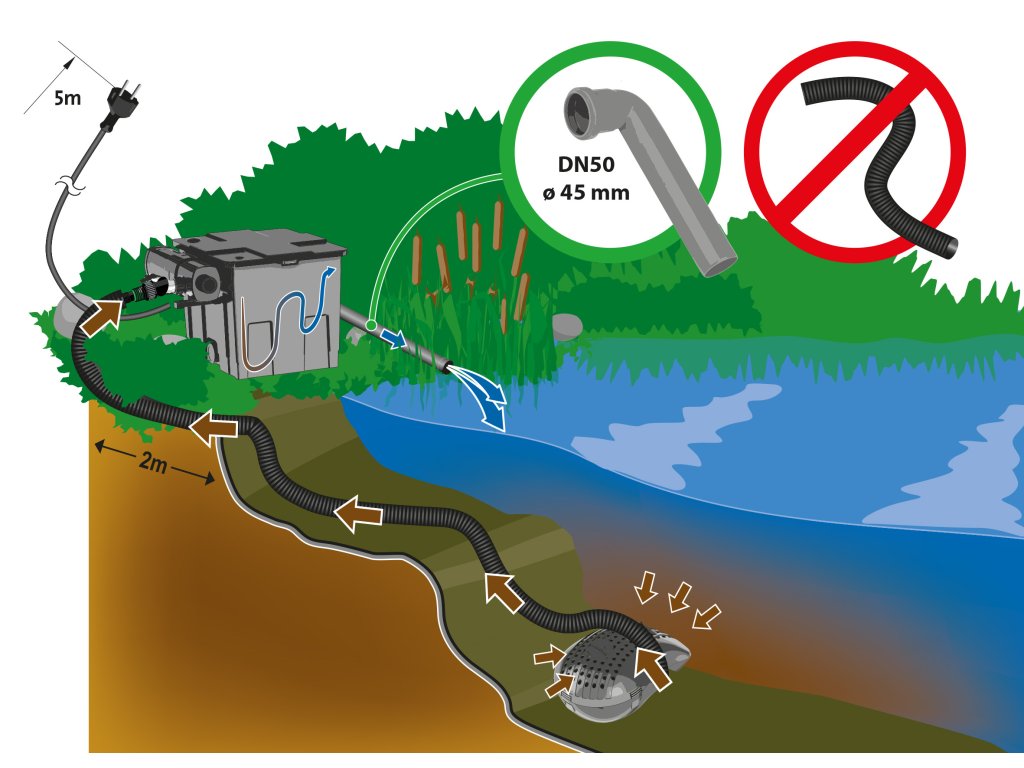 Umístěte čerpadlo na opačnou stranu od filtračního systému, tak aby docházelo k přirozené cirkulaci vody. Přívodní hadici a elektrický kabel veďte, tak aby nedocházelo ke zbytečnému kontaktu a posunu čerpadla při užívání jezírka.