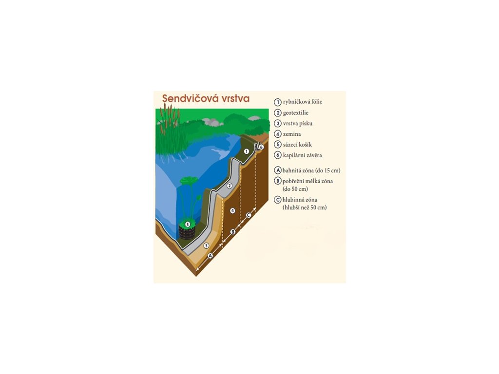 Naneste na všechny vodorovné plošky 10 cm vrstvu písku. Vyrovnávejte vodováhou a latí. Potom tuto jámu vyložte geotextilií. Fólii položte do středu jámy a odtud začněte s vyskládáním fólie. Nakonec fólii přetáhněte přes okraj a vytvořte kapilární závěru (žlábek vyplněný oblázky, okrasným štěrkem zabrání vzlínání vody z překladů fólie.)