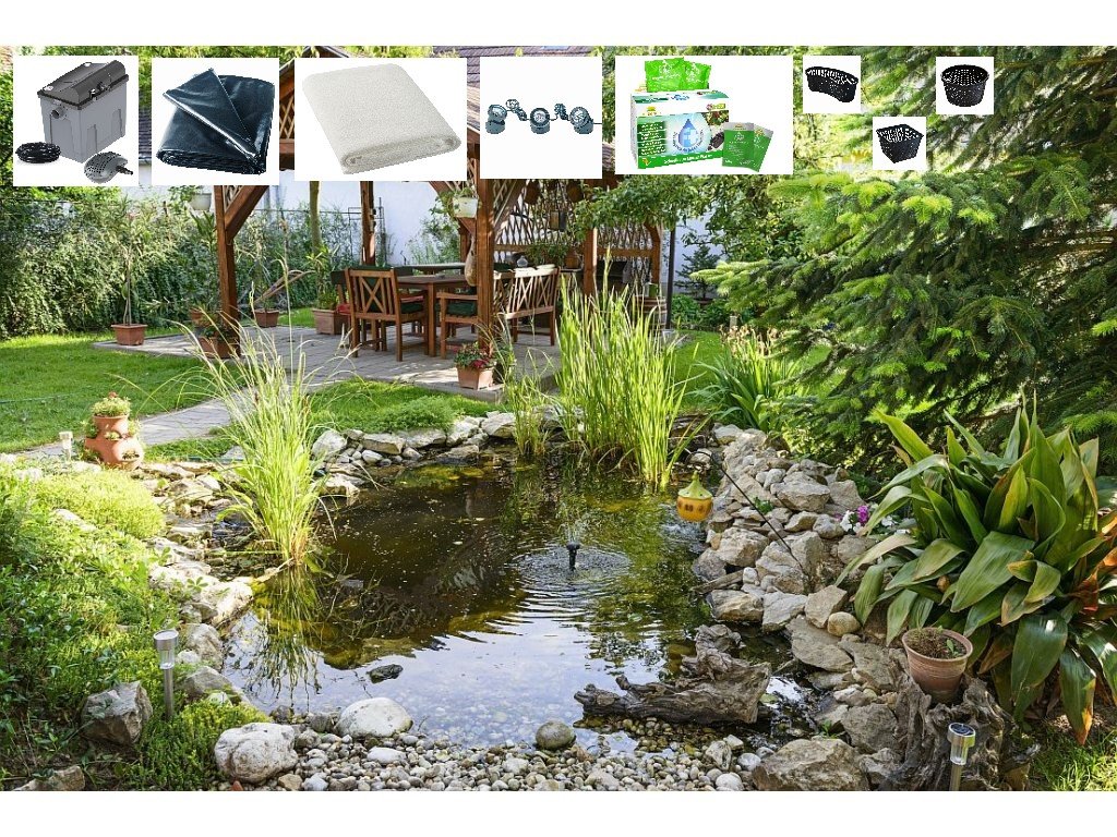 Sada pro výstavbu okrasného jezírka obsahuje jezírkovou fólii, ochranou jezírkovou geotextilii pod fólii, jezírkovou průtokovou filtraci včetně filtračních médií, bio domečky pro osídlení jezírkovými bakteriemi, filtrační houby pro hrubé nečistoty, regulovatelné čerpadlo s nízkou spotřebou, UV lampu proti tvorbě řas, hadicové přípojky na propojení čerpadla s filtrací a jezírkovou hadici. Dále roční sadu přípravku, obsahující úpravu vody, která reguluje tvrdost a ph vody, aby správně fungovali jezírkové bakterie odstraňující živiny z vody, druhá složka jsou právě jezírkové bakterie. Obsahuje 10 sáčků což stačí na pokrytí celé sezóny. Jezírkové osvětlení možné použít ve vodě i mimo, včetně výměnných barevných sklíček, pro změnu barvy osvětlení. Sázecí koše na vodní rostliny. Návod s návrhem na vybudování jezírka.